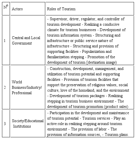 The central government and regional governments have an important role in creating and supporting the success of tourism in Cirebon. In balancing other tourism actors, the private sector or the business community, educational institutions and professionals, the government acts as a facilitator, regulator, and motivator. The balance between the role of government and the private sector in the development of tourism becomes a necessity to direct companies that have profit motives and prioritize benefits, and the community must play a more strategic, coordinated, or leadership role in tourism development (Brown & Essec, 1989). This can be implemented in the form of 3 actors who play a role in tourism in Cirebon, as described in Table2.