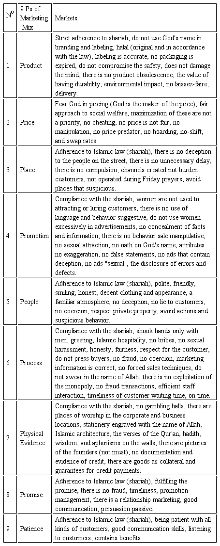 As for the perspective of Islamic marketing mix (Damirchi & Shafai, 2011; Abuznaid (2012), the application can be detailed as summarized in Table 3.