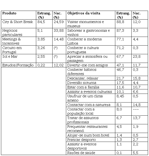 O inquérito motivacional à cidade de Lisboa 2018 (Turismo de Lisboa-Observatório de Lisboa, 2018) evidencia distintividade do perfil dos turistas em função da nacionalidade. Para os turistas estrangeiros a motivação primeira foi “férias, lazer ou recreio” (90,4%) (Turismo de Lisboa- Observatório de Lisboa, 2018, p. 4) e por segmentação por produtos. Apurou-se que 84,5% estava a realizar um “city & short break” e 5,1% viajava em “negócios”. Quanto aos turistas nacionais, a maioria foi motivada por questões profissionais (60,4%) e apenas 25,7% por “férias, lazer ou recreio” (Turismo de Lisboa-Observatório de Lisboa, 2018, p. 6). Em termos de segmentos, os negócios particulares destacam-se como motivação primeira (33,9%) (vide Tabela 1).