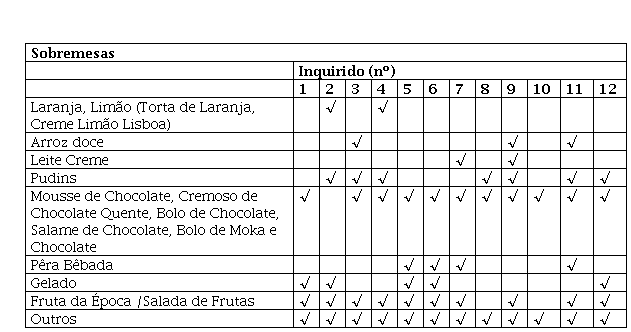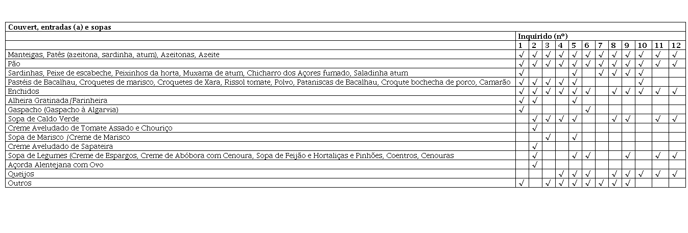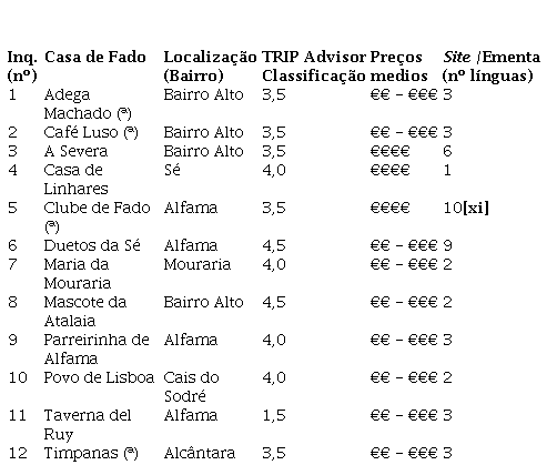 Legenda: Inq: Inquirido nº (de 1 a 12); €-€€€€: Custo por pessoa com a seguinte escala: € – fast food, self service; €€ - casual, sit-down servisse; €€€ - jantar mais formal (more formal dining); €€€€ - dispendioso e ocasião especial (most expensive, special occasion); (ª): Integram o “Fado & Food Group”