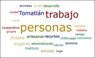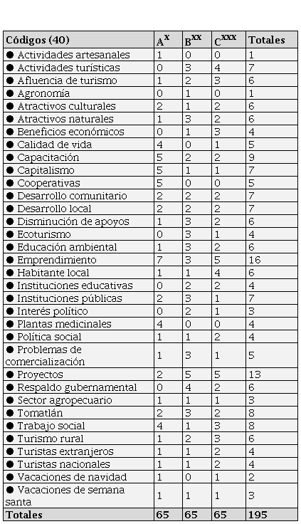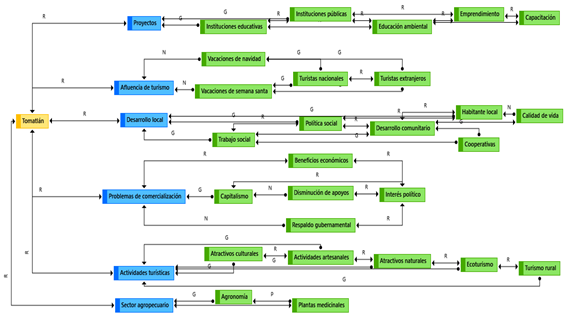Elaboración propia.La tabla de códigos configura las opiniones de los AEL asociando la frecuencias de las palabras que más resaltaron de las entrevistas, dando un total de 34 códigos, por consiguiente, el punto amarillo indica Tomatlán como punto focal, los puntos azules son los principales sectores dependientes o articuladores, por último, los puntos verdes son las derivaciones que se han presentado dentro del municipio. Por consiguiente, representan cada uno de los códigos vinculados y sus descripciones.