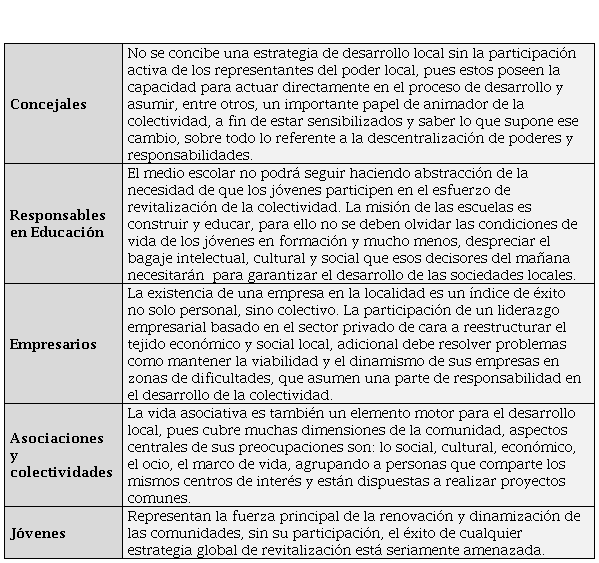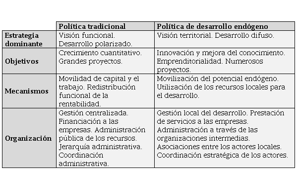 Para desarrollar una localidad hay que recurrir, además de los factores externos, a los factores endógenos propios del territorio y en todo caso el control del proceso de cambio correspondería a los actores locales que tienen capacidad de transformar el territorio con la participación en la toma de decisiones de inversión y localización.