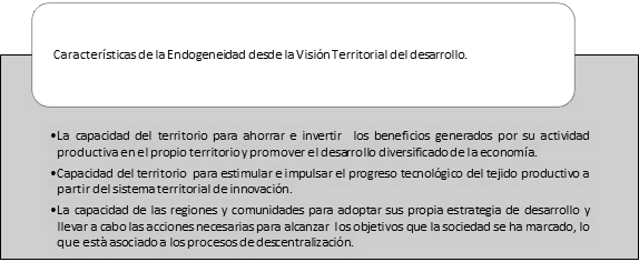 Stöhr y Taylor (1981) abogan por estrategias de ‘desarrollo desde abajo’ que permitan movilizar y canalizar los recursos y las capacidades del territorio; en este sentido Arocena (1995) indica que el desarrollo endógeno es un proceso en el que se integran los aspectos económicos y sociales. Boisier (2003) alude a los rasgos que caracterizan la ‘endogeneidad’ desde una visión territorial de desarrollo, en primer aspecto la refiere como: