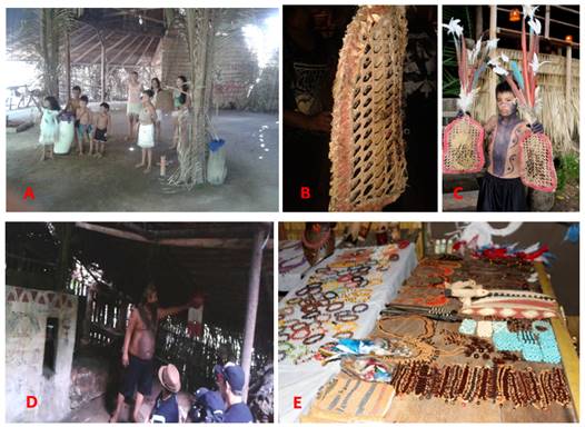 Acervo dos Autores (2018-2019).As formas de expressão cultural e uso do espaço da comunidade, se constituem no produto que a comunidade oferece para o turista, é este modo de vida que o visitante busca, a expectativa do encantamento e do medo que envolve o misticismo. Castro (2007) enfatizou que a tradição cultural de um povo, isto é, os saberes dos povos indígenas, estão ancorados na ecologia, de forma natural e cultural. Estes saberes têm atraído os não indígenas, sobretudo turistas em visitação à Amazônia. Nesta direção, em contexto do turismo étnico, se apoiam na cultura em busca de fazer a imersão no cotidiano em espaços indígena.