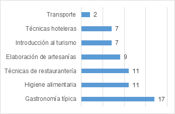 En relación a los aspectos de capacitación, los entrevistados consideran que las temáticas clave que necesitan para fortalecer sus capacidades deben ir en concordancia con las actividades ecoturísticas que desarrollarían. La Figura 2 muestra los temas resultantes.