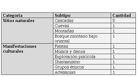 Con la aplicación de la metodología Acción Participativa, a través de talleres efectuados en la casa comunal parroquial, se logra el involucramiento de 18 representantes de familias de la comuna. Estos, con el acompañamiento de los investigadores, determinan que los atractivos que tienen mayor potencial, por sus características, son: 8 que se ubican en categoría sitio natural y 6 en manifestaciones culturales. En la Tabla 2 se describe el subtipo a los cuales perteneces los atractivos priorizados.