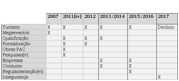 A demanda por formalização não é exclusiva da favela, muito menos da atividade turística da favela. Em 2011 foi criado o Programa Nacional de Acesso ao Ensino Técnico e Emprego [Pronatec], com o objetivo de dar acesso a cursos de grau técnico e formação inicial e continuada em instituições privadas e públicas de ensino técnico, com bolsas de estudo parciais e integrais. O Programa visava o aperfeiçoamento técnico para aqueles que desejavam integrar-se ao mercado de trabalho, para aqueles que necessitavam de especialização técnica e, finalmente, para aqueles que estavam à margem do mercado formal e informal, em vias de uma maior formalização das atividades econômicas individuais (Brasil, 2011).