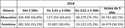 Dentre um universo total de 1.038.277 trabalhadores empregados no mercado formal do turismo em 2018, identificou-se 476.309 (45,9%) pessoas do gênero feminino e 561.968 (54,1%) do gênero masculino. Na Tabela 2, fica evidente que a categoria que recebe até dois salários mínimos, a menos valorizada, é a única com prevalência feminina, sendo que 53,2% são mulheres, enquanto 46,8% são homens. Quando se observa a faixa de maior remuneração, encontra-se uma situação inversa, verificando-se apenas 34,3% de mulheres e 65,7% de homens dentre as pessoas atuantes no setor turístico melhor remunerado.