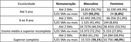 Primeiramente, é válido pontuar que é evidente que o setor do turismo apresenta baixa remuneração geral para suas trabalhadoras. Porém, é notória a distinção de distribuição da remuneração quanto ao gênero. Enquanto as mulheres representam a maioria apenas entre os salários mais baixos, até dois salários mínimos, nas faixas salariais intermediárias, entre dois e cinco salários mínimos, elas representam entre 25% e 30% dos empregados do setor turístico em tal faixa salarial. Os dados analisados demonstram mais claramente as assimetrias percebidas, quando a variável da escolaridade é inserida, possibilitando a percepção de que, apesar da proximidade entre o perfil de escolaridade entre os gêneros, com a estratificação por faixa salarial dentre o nível de formação, percebe-se como as mulheres são sub remuneradas em comparação a seus pares masculinos, como pode observado na Tabela 3.