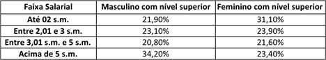 As disparidades se evidenciam quando se observam as faixas salariais mais altas dentro de cada nível de educação formal. Enquanto nas faixas salariais mais baixas encontra-se certo equilíbrio entre homens e mulheres, verifica-se que, nas mais altas, não se percebe predominância feminina em nenhum nível de escolaridade.
