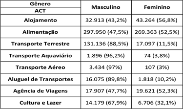 Assim, se percebe que, embora exista certa paridade de distribuição entre trabalhadores do gênero masculino e feminino nas atividades de alimentação e agências de viagens e, levando em consideração todas as demais atividades, as pessoas do gênero feminino só superam quantitativamente as do gênero masculino em alojamento, alimentação e em agências de viagens. Porém, ao observar atentamente, identifica-se uma disparidade maior quando se analisam as atividades relacionadas às atividades de transportes, de modo geral, em que todas essas a presença feminina não atinge sequer 12% entre os trabalhadores. Tal situação, apesar de menos discrepante, será observada também no mercado formal do turismo, já que a divisão sexual do trabalho, em que existem funções historicamente atreladas ao feminino e outras ao masculino, se faz presente em nossa cultura até a atualidade.