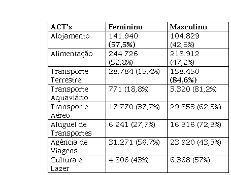 Ainda sobre o mercado de trabalho formal, é interessante notar a distribuição das trabalhadoras por gênero entre as atividades características do turismo. Ressalte-se que é perceptível a carga cultural na divisão quantitativa de homens e mulheres pelas atividades características do turismo. Historicamente, os trabalhos externos, em especial aqueles considerados como ‘pesados’, como por exemplo, os relacionados a transportes, foram priorizados pelos homens e considerados, culturalmente, masculinos. Já os relacionados a alojamento, alimentação e agências de viagens, são trabalhos internos, muitas vezes ainda relacionados a afazeres domésticos, preponderando ainda a presença feminina.