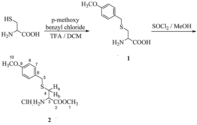 A solution of 4-methoxybenzyl chloride (5.8 g, 37 mmol) in dichloromethane (250 mL) was added dropwise to a solution of L-cysteine (5g, 37mmol) in trifluoro acetic acid/dichloromethane (45 mL/250 mL), over a period of 1 h at 0°C. The reaction mixture was stirred for 2 h at room temperature. Then methanol (150 mL) and water (500 mL) were added, the layers were separated and the organic layer was re-extracted with water (100 mL). The aqueous layer was washed with DCM, filtered and solvents were removed in vacuo. The residue was dissolved in water, brought to pH 6 with 10% NaHCO3 and the product was recrystallized from methanol/water (3:1). The obtained compound (5 g) was dissolved in anhydrous methanol (100 mL) and thionyl chloride (6 mL) was added dropwise at 0 ° C. The reaction mixture was stirred for 3 h at room temperature. Methanol was then evaporated and the residue was washed with diethyl ether. It was obtained as white solid (80%); melting point: 80 °C; 1H NMR (CDCl3, 300MHz): δ 2.88-2.91 (m, 1H, Ha), 2.98-3.04 (m, 1H, Hb), 3.77 (s, 2H, H-5), 3.78, 3.82 (2 x s, 6H, H-1 and H-10), 4.12 (m, 1H, H-3), 6.88 (d, J =8.7Hz, 2H, 2 x H-8), 7.28 (d, J =8.7Hz, 2H, 2 x H-7); 13C NMR (CDCl3,125MHz): δ 31.62 (C-4), 35.74 (C-5), 52.66 (C-1), 53.27 (C-3), 55.97 (C-10), 114.69 (2 x C-8), 130.38 (C-6), 131.11 (2 x C-7), 159.24 (C-9) and 169.52 (C-2); IR (KBr) υmax 3412.57 (NH2 str), 2840.36, 2637.14, 1745.85 (C=O), 1610.29, 1581.69, 1510.70, 1439.71, 1324.76, 1304.90, 1247.67, 1204.88, 1176.08, 1150.57, 1106.61, 1059.79, 1034.70, 995.41, 930.54, 870.01, 830.93, 777.10, 684.89 and617.09 cm-1;UV (methanol) λmax 278 nm; HRMS: C12H18O3NSCl [M]+ 291.2902.