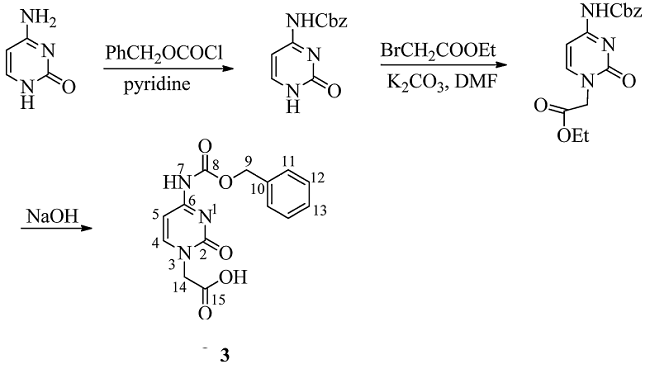Benzyloxycarbonyl chloride (5.2 mL, 36mmol) was added dropwise to a suspension of cytosine (2g, 18mmol) in anhydrous pyridine (100 mL) at 0 oC. The mixture was stirred overnight and, subsequently, the pyridine suspension was evaporated to dryness. Water (20 mL) was added and pH was adjusted to 1 with aqueous 4 M HCl. The resultant white precipitate was filtered off, washed with water and partially dried. The wet precipitate was boiled with absolute ethanol (50 mL) for 10 min, cooled to 10 °C, filtered, washed thoroughly with ether to yield compound 6 in 85% yield. Ethyl bromoacetate (0.5 mL, 4.1 mmol) was then added to a suspension of N4-benzyloxycarbonyl cytosine (1 g, 4.1 mmol) and K2CO3 (570 mg, 4.1 mmol) dissolved in dimethyl formamide (10 mL). The reaction mixture was stirred overnight at room temperature. The solution was then filtered and evaporated to dryness. The solid residue was treated with water (4 mL) and 4 M HCl (0.2 mL), stirred for 15 min at 0 °C, filtered and washed with water. Water (2.5 mL) was added to N4-benzyloxycarbonyl cytosine-1-yl-acetic acid ethyl ester (800 mg, 2.4 mmol) and 2 M NaOH (3 mL) and stirred for 2 h. The reaction mixture was cooled to 0 °C and filtered. The compound was precipitated by the addition of 4 M HCl (2 mL). The compound was obtained by recrystallization with methanol as white solid (60%); melting point: 272 °C (Literature value = 266-274 °C); 1H NMR (CDCl3, 300MHz): δ 4.54 (s, 2H, H-14), 5.19 (s, 2H, H-9), 7.06 (d, J =6.8Hz, 1H, H-5), 7.35-7.40 (m, 5H, C6H5), 8.00 (d, J=6.6Hz, 1H, H-4); 13C NMR (CDCl3, 75 MHz): δ 50.54 (C-14), 66.53 (C-9), 94.03 (C-5), 127.95 (2x C-11), 128.17 (C-13), 128.49 (2x C-12), 135.96 (C-10), 150.42 (C-4), 153.18, 155.03 (C-2 and C-8), 163.31, 169.37 (C-6 and C-15); IR (KBr) υmax: 3423.87 (NHCO), 3143.94, 2953.22, 2524.06, 1759.05 (NHCO), 1712.63 (COOH), 1678.72 (C=O), 1629.46, 1582.61, 1517.58, 1454.32, 1416.24, 1371.21, 1332.40, 1248.15, 1215.41, 1069.28, 1007.24, 981.10, 901.54, 802.38, 780.06, 738.75, 694.29, 634.79, and 607.86 cm-1; UV (methanol) λmax: 298nm; HRMS: C14H13O5N3 [M]+ 303.6239.