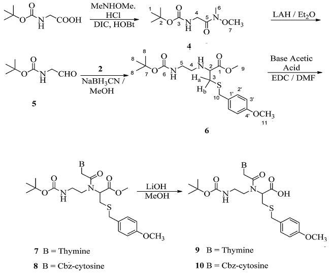 The final steps to the target PNA building block comprised the EDC-mediated installation of the suitably protected nucle-obase followed by saponification using 4 M lithium hydroxide in methanol (Scheme 3). Nucleobases thymine and cytosine were incorporated via methylene bridges. Since thymine does not contain any side chain which is to be protected so thymine acetic acid was used as such but the exocyclic amino group of cytosine was protected to prevent self-condensation. The amino group of nucleobase cytosine was protected using the benzyloxycarbonyl (Cbz) group and then introduction of acetic acid was carried out for coupling on backbone (Scheme 2).