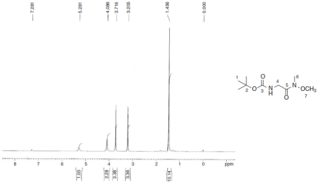 Hydroxybenzotriazole (7g, 45.7mmol) was added to a solution of boc-glycine(5 g, 28.6 mmol) in anhydrous dimethyl formamide (50 mL) followed by the addition of N,O-dimethylhydroxylamine hydrochloride (4.5 g, 45.7 mmol), DIPEA (7.9 mL, 45.7 mmol) and DIPC (9 mL, 57.1 mmol). The reaction mixture was stirred overnight at room temperature. The solution was poured into water (100 mL) and then filtered. The compound was extracted with ethyl acetate (3x 40 mL). The organic layer was washed with 10% KHSO4, 10% NaHCO3, water and finally brine. The organic layer was dried with Na2SO4, filtered and evaporated to a small volume. The product was purified through column chromatography using silica gel (100-200 mesh) in ethyl acetate/petroleum ether (1:1). Compound 4 was obtained as white solid (80%); melting point: 100 °C; 1H NMR (CDCl3, 300MHz): δ 1.46 (s, 9H, H-1), 3.21 (s, 3H, H-6), 3.72 (s, 3H, H-7), 4.09 (s, 2H, H-4) and 5.28 (brs, 1H, NH); 13C NMR (CDCl3, 75MHz): δ 28.31 (3 x C-1), 32.37 (C-6), 41.68 (C-4), 61.41 (C-7), 79.60 (C-2), 155.86 (C-3) and 170.18 (C-5). IR (KBr) υmax: 3333.33 (N-H str), 3289.71, 3006.83, 2975.75, 2932.75, 1717.43 (COO), 1658.26 (NCO), 1619.57, 1572.61,1447.43, 1401.80,1365.72, 1285.99, 1250.32, 1170.30, 1128.03, 1030.63, 985.00, 946.16, 871.52, 807.40, 780.10, 761.18 and 621.05 cm-1; HRMS: C9H18O4N2 [M]+ 218.2502.