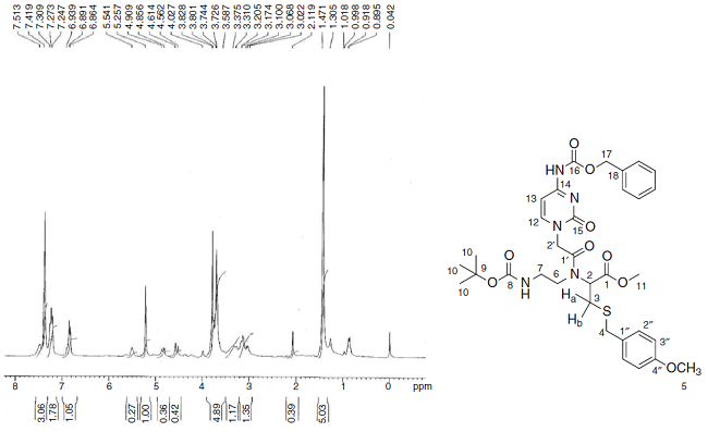 In the 1H NMR spectrum for 2-[{2-(N4 -Cbz-cytosin-1-yl)-acetyl}Boc-aminoethylamino]-3-(4-methoxybenzyl sulfanyl)-propionic acid methyl ester (8) (Fig. 3), a characteristic singlet for nine protons for three methyl groups at δ 1.47 and corresponding peaks in 13C NMR, at δ 28.62 along with δ 79.29 were due to the presence of the boc group. The methylene groups of ethylene diamine backbone (H-6 and H-7) and proton present at the chiral centre of cysteine moiety (H-2) appeared in the range δ 3.02-3.38. The two diastereotopic protons of cysteine Ha and Hb appeared as a multiplet in the range of δ 4.59-k88. The methylene protons of the benzyloxy group (H-17) appeared at δ 5.26 and a multiplet for the aromatic protons of the Cbz group along with the aromatic protons of cytosine (H-12 and H-13) appeared in the range δ 7.31-7.51. That confirms the presence of Cbz-protected cytosine moiety. In the 13C NMR spectrum, peaks for two methylene carbons of ethylene diamine moiety were observed at δ 39.82 and 49.24 for C-6 and C-7, respectively. Characteristic peaks for cytosine were observed at δ 94.67 (C-13) and δ 151.35 (C-12). The amide carbonyl (C-1') and ester carbonyl (C-1) appeared in the range δ 164.12-170.90. In HRMS, the [M+H]•+ peak was observed at 684.1031 having a molecular formula C33H41O9N5S (calculated value: 684.0625).