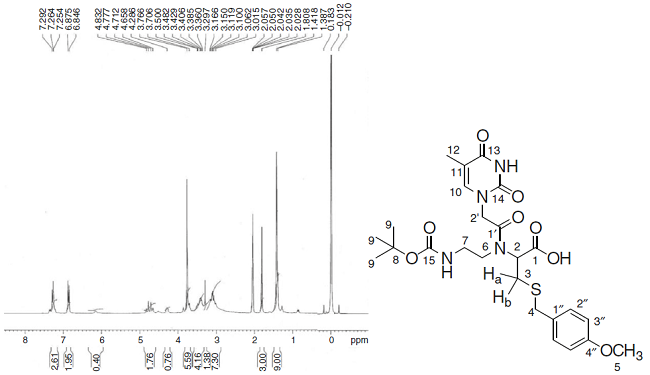 Reduction of Weinreb amide with lithium aluminium hydride yields an aldehyde, (2-oxo-ethyl)-carbamic acid tert-butyl ester (5) and its subsequent reductive amination with methyl-2-amino-3-(4-methoxybenzylthio)propanoate hydrochloride (2) yields PNA backbone that contains ligation handle, sulfhydryl group at α-position. Compound (6) was obtained in 40% yield as colourless oil. In its IR spectrum, it showed characteristic peaks at 3357 cm-1 that describe N-H stretching. In the 1H NMR spectrum (Fig. 2), a characteristic singlet at δ 1.45 for nine protons was observed for the three methyl groups of boc and the corresponding carbons in 13C NMR appeared at δ 28.43 while the boc tertiary carbon appeared at δ 79.17. A multiplet in the range δ 2.58-2.63 was assigned to one of the diastereotopic proton Hb. Another multiplet in the range δ 2.67-3.16 was observed for another diastereotopic proton Ha and two methylene groups (H-4 and H-5) of ethylene diamine unit. The corresponding carbons for C-4 and C-5 appeared at δ 47.27 and δ 52.11, respectively in 13C NMR. The chiral centre of cysteine, i.e. H-2 appeared down-field as multiplet in the range δ 3.30-3.39 because of the attached thiol linkage. A singlet for methylene group attached with the sulfhydryl group was observed at δ 3.69, while two singlets corresponding to two methoxy groups were observed at δ 3.73 and δ 3.79 that explain the incorporation of suitably protected cysteine in the backbone at α-position. Two ortho coupled doublets (two protons each) at δ 6.85 (J =8.4Hz) and δ 7.23 (J =8.4Hz) were assigned to the aromatic protons of S-benzyl group. In 13C NMR spectrum, peaks at δ 34.25 and δ 36.18 were identified for two methylene groups, C-3 and C-10 attached to the thiol group. The two methoxy groups were observed at δ 55.29 and δ 60.55, while the carbonyl of the ester group was observed at δ 174.03.