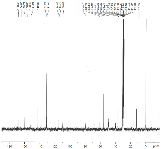 In the 1H NMR spectrum for 2-[{2-(Thymin-1-yl)-acetyl}boc-aminoethylamino]-3-(4-methoxybenzylsulfanyl)-propionic acid (9) (Fig. 4), a characteristic singlet for nine protons at δ 1.42 explains the presence of the boc group. A singlet for the methyl group at δ 1.81 for three protons was assigned to the thymine methyl group. The thymine ring proton (H-10) appeared as multiplet along with aromatic protons (H-3”) in the range δ 7.25-7.29. As multiplets in the range δ 3.30-3.50, the methylene groups of ethylene diamine backbone (H-6 and H-7) appear along with the proton present at the chiral centre of cysteine moiety (H-2). In the 13C NMR spectrum (Fig. 5), peaks for two methylene carbons of ethylene diamine moiety were observed at δ 39.76 and 49.01. Characteristic peaks for the methyl group of thymine was observed at δ 13.35. The amide carbonyl (C-1’) and acid carbonyl (C-1) were assigned in the range of δ 164.86-168.40. The identity of the modified PNA monomers was confirmed by NMR, IR and mass spectrometry.
