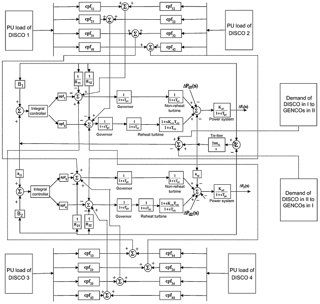The projected deregulated system is a two-area system with two GENCOs and two DISCOs in each area. The block diagram of LFC model in deregulated scenario is given in Figure 1. The resultant DPM matrix can be expressed as given below, where ‘cpf’ represents the contract participation factor.
