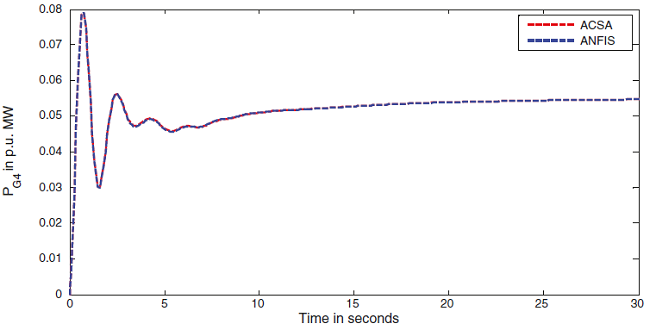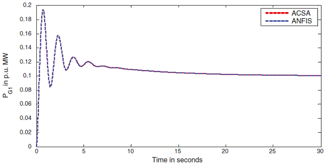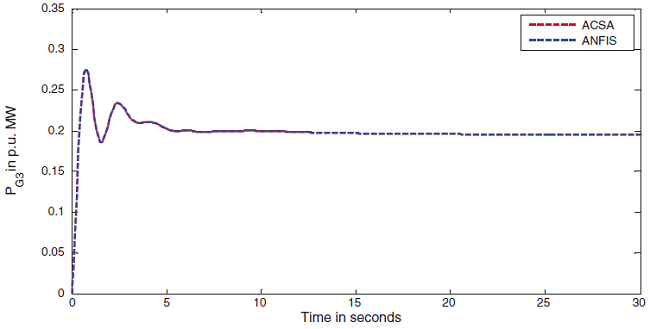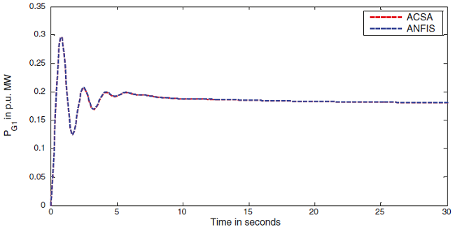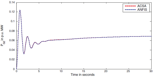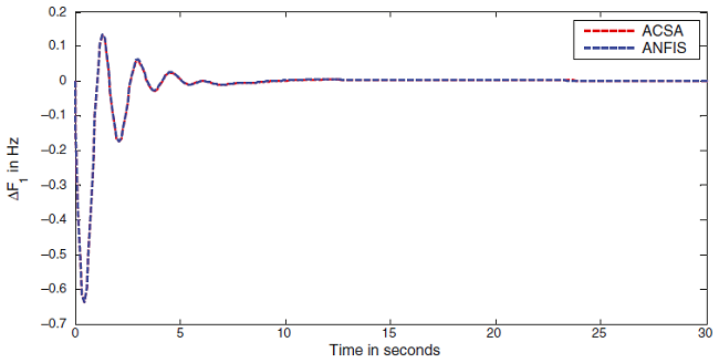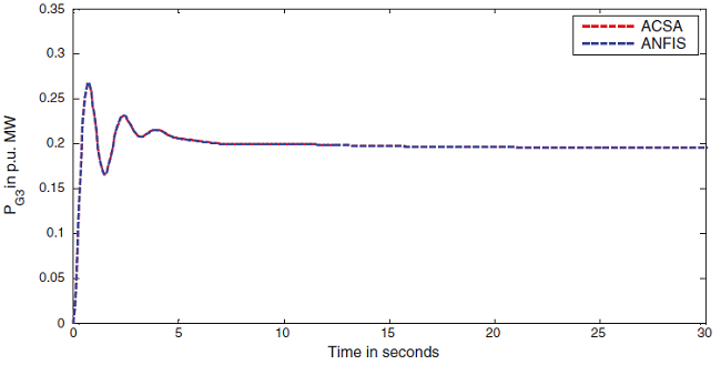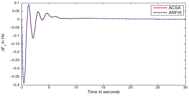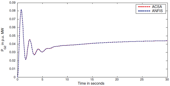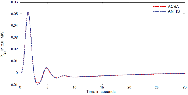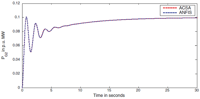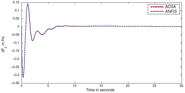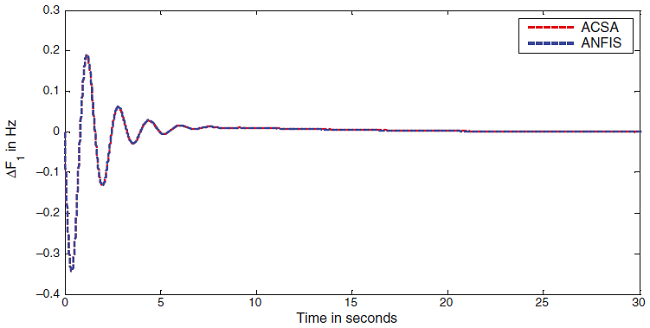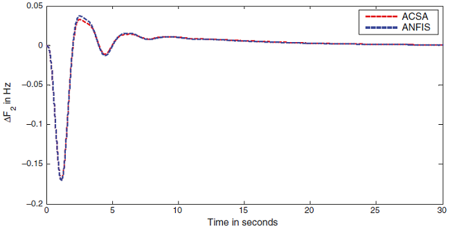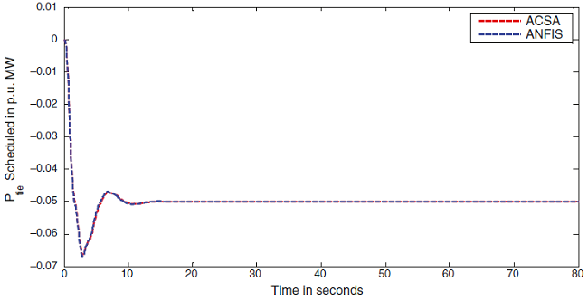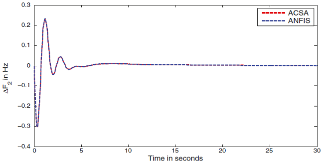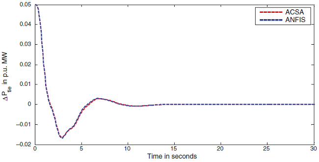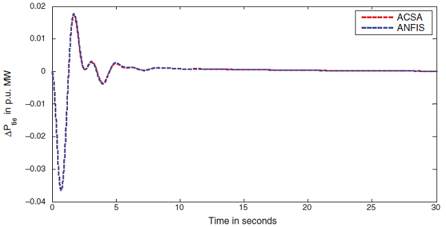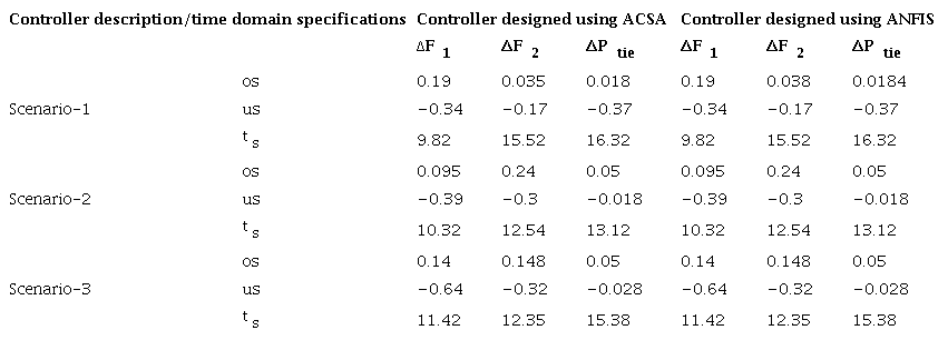 The area frequency deviations are measured in Hz, tie-line power deviations are measured in p.u. MW and settling time in seconds. Table 3 shows the comparison table of the system performance parameters. In scenario-1, the peak frequency overshoot in area-1 with controller designed using ACSA is 0.19 Hz, which is almost identical to the frequency overshoot in area-1 with controller designed using ANFIS. The peak frequency overshoots in area-2 and tie-line power deviations with controller designed using ACSA are 0.35 Hz and 0.018 Hz respectively. The peak frequency overshoots in area-2 and tie-line power deviations with controller designed using ANFIS is also 0.035 Hz and 0.018 p.u. MW respectively. The overshoot for tie-line power deviations with both ACSA designed controller and ANFIS controller is approximately 0.018 Hz. Similarly, the settling time for area frequency deviation and tie-line power deviations using ACSA designed controller and ANFIS controller is almost identical. This pattern of performance exists in scenario-2 and scenario-3 also. The ANFIS controller responses are similar to the responses of ACSA designed controller. This increases the overall efficiency of ANFIS controller for online application.