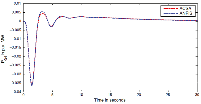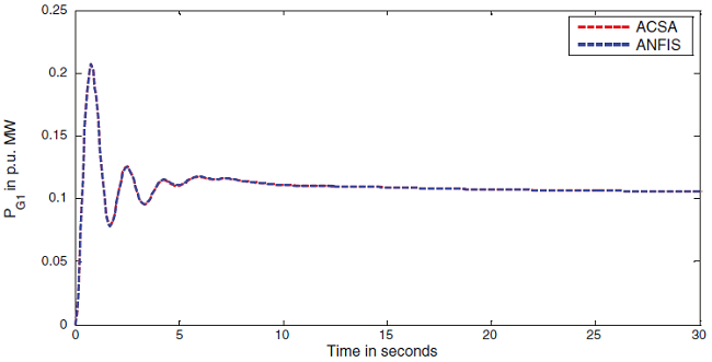 The simulation outcomes make known that the ACS tuned ANFIS controller responses are almost matching the responses of ACS tuned controller responses. Inspection of the objective function values reveals that the objective function values are to some extent equal when an ANFIS controller is used as compared to the ACS controller. The iteration graph i.e., Figure 26 shows that the ACS algorithm takes almost 15 iterations for convergence which takes approximately 30 s. The ANFIS controller takes only a fraction of a second. This indicates the superior performance of ACS tuned ANFIS controller and its adaptability for online applications.