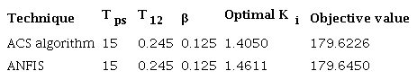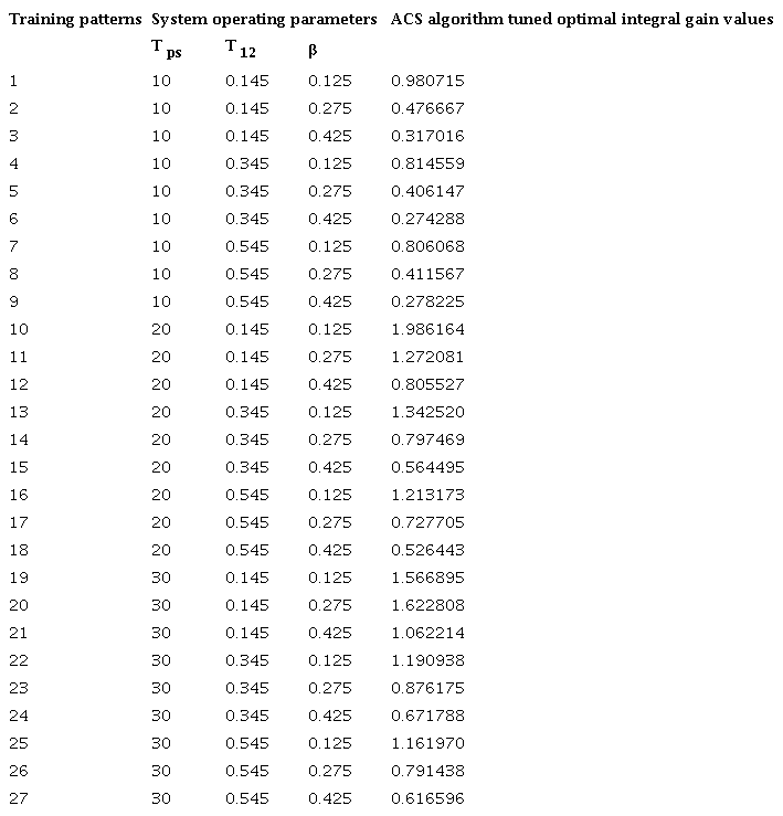 The performance of the fixed gain controller deteriorates with change in system operating conditions. To have preferred system performance, it is essential to take into account the performance of the system over an extensive range of operating conditions. In this paper, power system time constant Tps, synchronizing power coefficient T12 and frequency bias setting β which correspond to the system operating condition have been used as input to the ANFIS network. Three numbers of fuzzy membership functions have been used. Twenty seven different fuzzy rules have been framed for this controller. It uses a bell shaped fuzzy membership function. Twenty seven numbers of training samples have been used. The pattern for training are generated for diverse values of system parameters Tps , T12 and β. If the numbers of training patterns are large, the network training process will be very slow (Farzi, 2012; Jain et al., 2013). To overcome this drawback, only twenty seven different combinations of system parameters have been used. The calculated integral gain values for the twenty seven different power system operating condition patterns by using ACS algorithm are tabulated in Table 1 as follows.