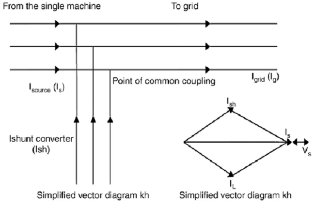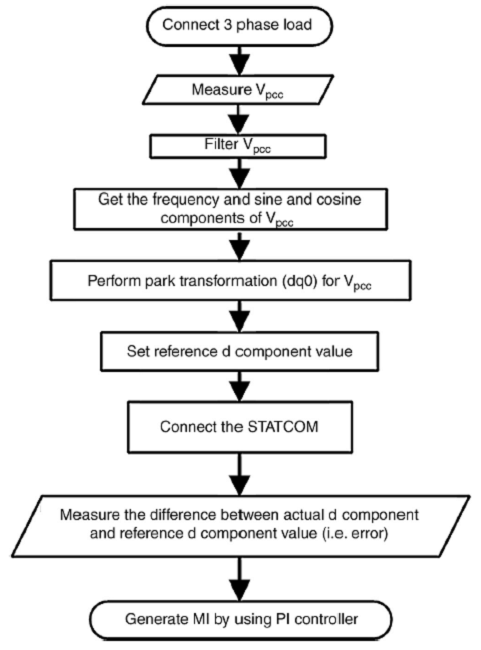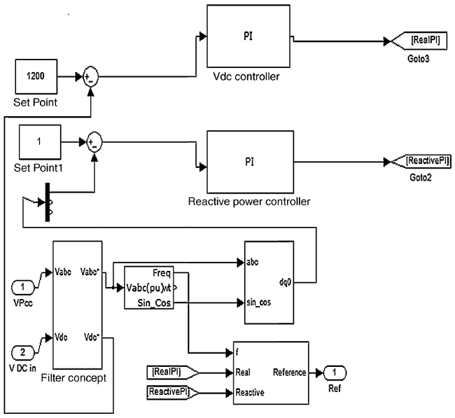As the other controller maintains the voltage at the point of common coupling, the methodology is to inject the appropriate reactive current into the AC system such that the exact quantity of reactive power demand of the load is met with at a fixed AC voltage. The reactive power flow into the load from the mains has an influence on the bus bar voltage. The changes that occur at the 'd' component of the orthogonally displaced 'd' and 'q' components of the park transformed three-phase line voltage system is a function of the reactive power drawn by the connected load.