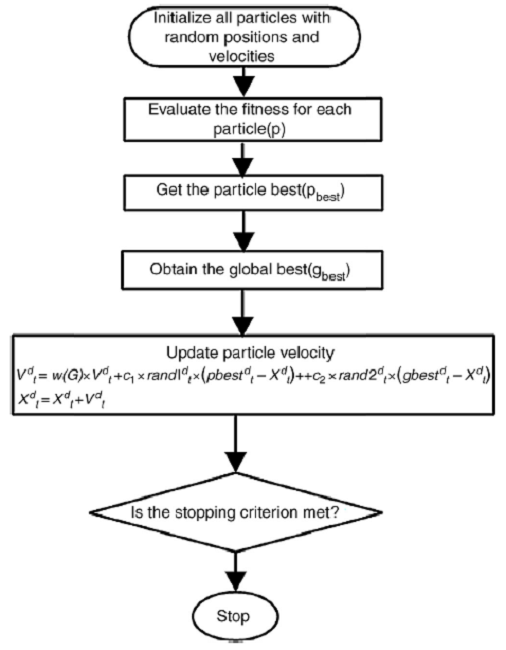Based on the vector of the personal best of each particle and based on the vector of the globally best performing particle, a velocity is estimated and this velocity is added up respectively with the updated best performing vector of each particle. Thus, at the end of each iteration, the vectors of all the particles are updated and the performance evaluated with Eqs. (5) and (6).