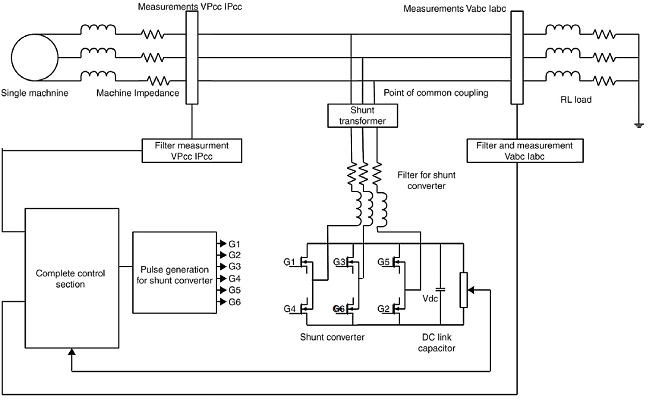 Structurally the DSTATCOM, whether for grid-based applications or for applications in the distribution systems, assumes the three-phase three legs Graetz bridge arrangement consisting of six power electronic switches arranged in the three leg converter as shown in Figure 1.