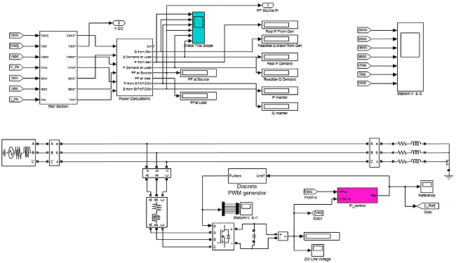 The main blocks of the MATLAB SIMULINK model of the proposed system and the model of PI controller are given in Figures 12 and 13, respectively. Detailed display systems of all the parameters are included in the model. The control technique of the DSTATCOM involves park transformation and for that purpose, the estimations of the source side frequency and its phase are required. Figure 12 shows the blocks interconnecting the PLL unit, the Park transformation unit, the controllers pertaining to DC link voltage and Vpcc.
