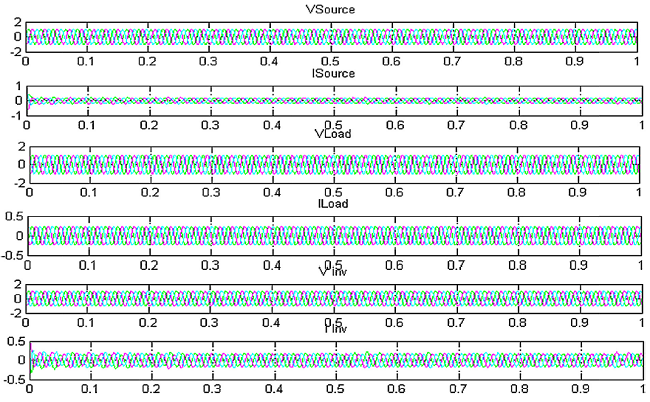 With the purpose of demonstrating the performance of the proposed method, an RL load is selected, such that the power factor is nearly = 0.707. Without the DSTATCOM in action with the source side, it is burdened with real and reactive loads of 5 kW and 5 KVAR, respectively. The load and the source side power factor are close to each other = 0.707. With the DSTATCOM in action, the reactive component of the load Q = 5 KVAR is fully supported and the main source is relieved from the reactive demand. The load side power factor being 0.707, the source side power factor is improved to nearly 0.93. The source current is also reduced accordingly.