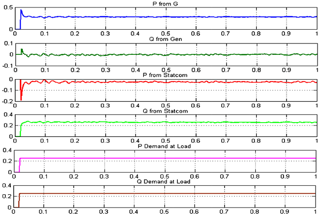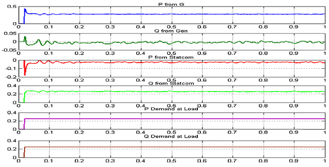 With a purely resistive load d component of the voltage at the point of common coupling will be practically very close to the unit. With the inclusion of reactive power load, this quantity falls down and the DSTATCOM will inject reactive current into the load through the bus. This action takes the d component of the voltage at the point of common coupling back to near unity condition.