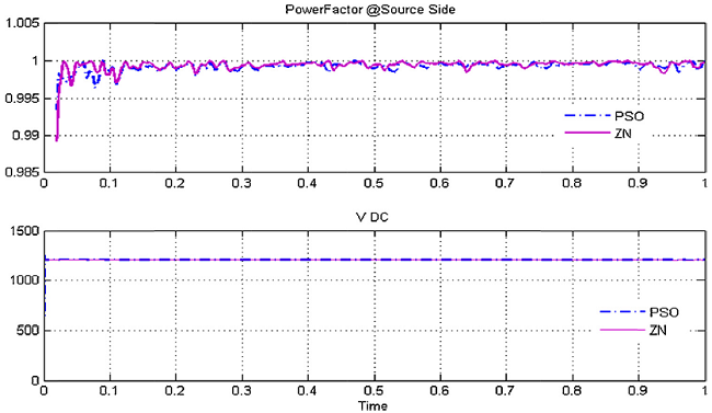 Finally, a comparison of the DC link voltage is shown in Figure 21. The Quality of the DC link voltage obtained in the case of using PI controllers with Ziegler-Nichols tuning technique is inferior and it contains more ripples than that of PI controllers tuned by the PSO method.