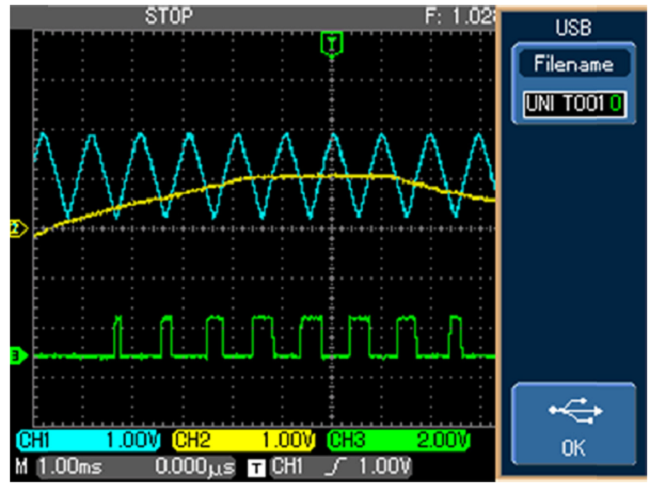 The carrier wave of 1 kHz is generated using an operational amplifier-based triangular wave generator. The typical waveform of the triangular wave is shown in Figure 24. The three-phase reference wave is generated using the three-phase sample waves derived from the line at the point of common coupling so as to enable line synchronous operation.