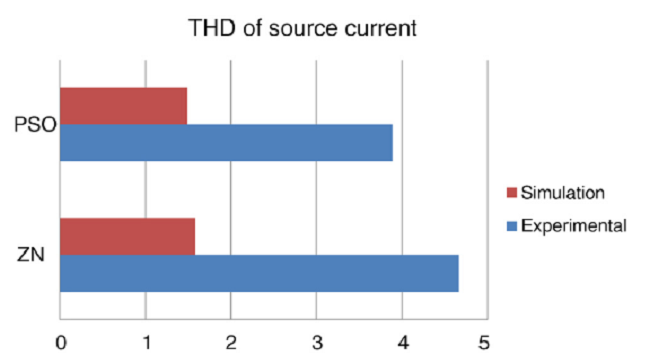 In the compensation of the reactive power using the DSTATCOM, being a switched system, there are chances of the line getting polluted. Therefore, comparisons of the THD of the source voltage with both the approaches are shown in Figures 17 and 18. It is evident that the THD of the source current is less in the case of the PSO-tuned PI controllers than for the Ziegler-Nichols-tuned PI controllers. The matrices of real and reactive power flow in both the cases are shown graphically in Figures 19 and 20. The simulation results are compared and shown in Table 3.