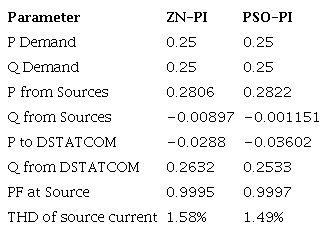 Considering the differences in the control system, the performance parameters and the power flow parameters, it can be inferred that the PSO-based tuning technique is far superior to the Ziegler-Nichols tuning method in the case of a DSTATCOM, meant for reactive power compensation.