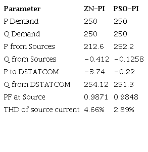 Two approaches have been used in this work for the estimation of Kp and Ki values of the two PI controllers involved in the management of reactive power using the DSTATCOM and they are the Ziegler-Nichols approach and the PSO approach. Table 2 gives the values of Kp and Ki for the two controllers as derived from the two approaches.