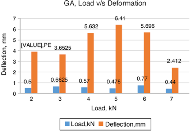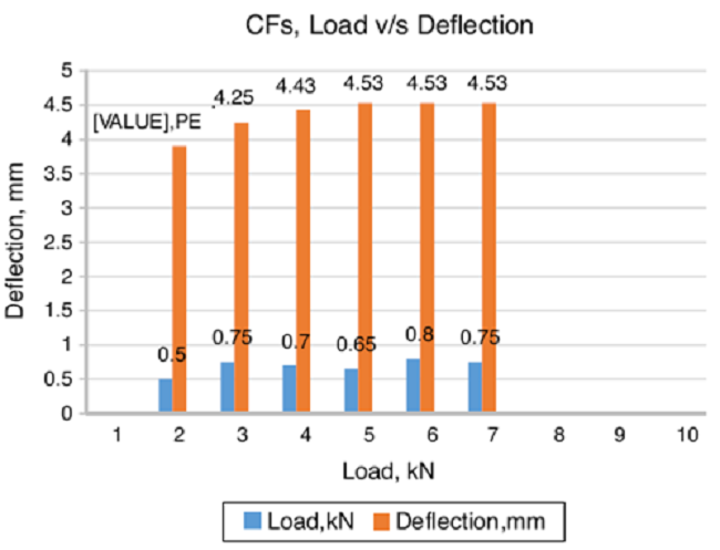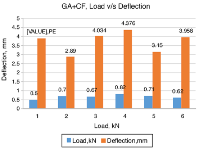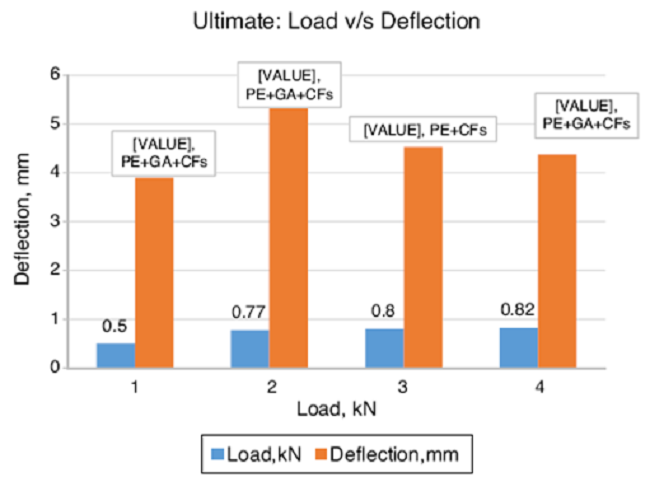 The evaluation of the optimum percentage of carbon fibres and graphene and the combination required for reinforcing in plain epoxy beams was studied based on the three-point load-ing tests conducted. The optimum percentage of carbon fibresand graphene by wt% of epoxy required to reinforce the plain epoxy beams was evaluated based on the higher structural efficiency in terms of load carrying capacity. Hence, the flexural behaviour of GA/CFs/GA + CFs reinforced in the epoxy beamswas investigated. Composite beams were tested under flexure (three-point loading) to evaluate their mechanical properties such as strength, deflection criteria, among others. The results obtained were then compared with the results of the tests onthe control beams. The ultimate load carrying capacity of allthe different fillers is provided in Table 5. The load-deflection curves for different proportions of GA-reinforced epoxy composite beams subjected to the three-point loading test are shown in Figure 3. The load-deflection curves for different proportions of CF-reinforced epoxy composite beams subjected to the three-point loading test are shown in Figure 4.