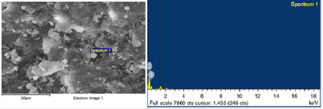 Figure 7 shows the SEM micrograph and EDS spectrum of the GA/epoxy composite with 0.4 wt %, which shows high bonding strength that occurs between the GA and epoxy matrix achieved.This is consistent with other results published in the literature. Experimental observations revealed that the GA-reinforced epoxy composite beams showed increased strength compared with the plain epoxy beams. The nano-level reinforcement significantly improved the flexural strength of the beams. The results showed an increase in the load carrying capacity of the composite beams compared with the reference beams.