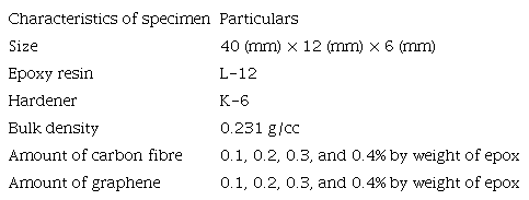 The properties of the GAs used in this case are given in Table 1 and they were of industrial grade with a purity greater thanor equal to 95 percent. The specimen characteristics are mentioned in Table 2. The specimen reference has been mentioned in Table 3. Uniform dispersion of carbon fibre against their agglomeration due to Vander Waals bonding is the first step in the processing of nano-composites. Dispersion is a critical issue while mixing carbon fibres in either water or organic solvents.
