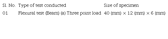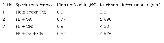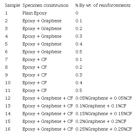 As the hydrophilic nature of fillers could lead to reduced interfacial adhesion between the fillers and the holding matrix, method of sonication adopted, duration of sonication and method of casting, the specimens were maintained uniformly throughout.Different predefined amounts of CF and GA were added to thepolymer matrix as shown in Table 3, and the whole mixture was kept in an ultra sonicator for 60 min to achieve uniform dispersion in the matrix.