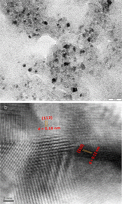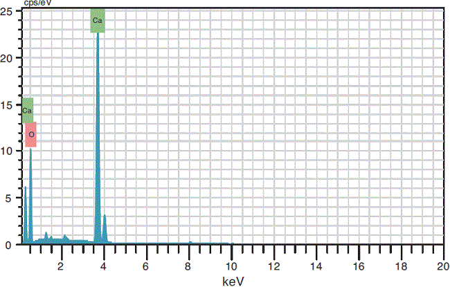 X-ray diffraction patterns of CaO2 are shown in Figure 2. The diffraction peaks at 2θ = 30.47°, 35.75°, 47.46°, 53.28°, 60.82° and 87.1° can be respectively indexed to (0 0 2), (1 1 0), (1 1 2), (1 0 3), (2 0 2) and (3 1 0) reflections of CaO2 nanoparticles and match the reference patterns of standard file of CaO2 (Joint Committee for Powder Diffraction Studies (JCPDS) File No. 03-0865). The morphology of prepared CaO2 nanoparticles was studied by the HR-FESEM analysis (Fig. 3a and b). It can be clearly indicated that nanoparticles was looked like the aggregated round shape and are mostly spherical in shape. EDS showed the trace spectrum of CaO2 nanoparticles as shown in Figure 4. The atomic compositions for calcium (Ca) and oxygen (O) were 42.88% and 57.12%, respectively. Figure 5a displays the TEM image of large number of CaO2 nanoparticles with approximately uniform shape and size. It can be clearly seen is near spherical in shape with average particle size of about 10-40 nm. Figure 5b shows HR-TEM images of synthesized CaO2 nanoparticles. The HR-TEM images clearly confirms, CaO2 nanoparticles have a lattice structure with an interplanar spacing about 0.18 and 0.12 nm, which corresponds to (1 1 2) and (3 1 0) plane of CaO2 respectively. These results are reliable with the XRD pattern.