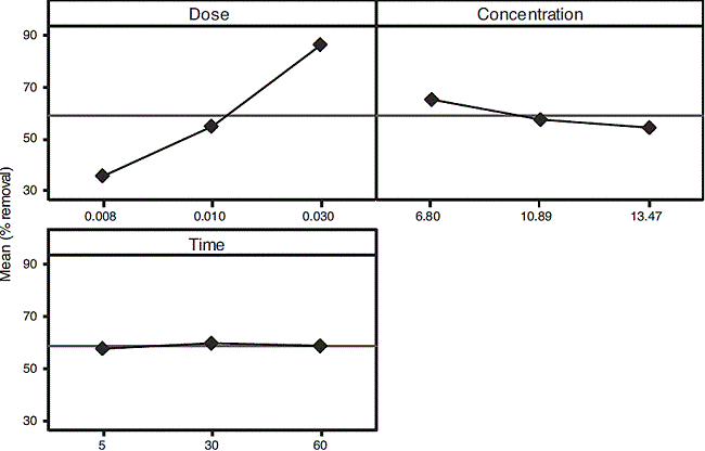 Analysis of variance (ANOVA) was performed to investigate which process parameters significantly affect the process responses and to determine the percent contribution of each operational variable to the response (Engin et al., 2008; Sadrzadeh & Mohammadi, 2008). Table 6 shows the result of ANOVA test for mean response. ANOVA also used for estimate the error variance. The most significant factors that affect benzeneacetic acid removal was found to be adsorbent dose (93.78%) >initial concentration (4.72%) >contact time (0.16%). Percent contribution (P-ratio) is defined as a relation between the parameters’ sum of square to the total sum of square, which indicates the contributions of these parameters (Nik, Sadrzadeh, & Kaliaguine, 2012):