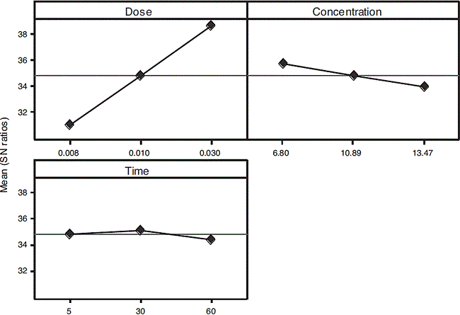 According to the Taguchi L9 (33) OA, nine experiments were performed, and each experiment was repeated twice which were denoted by R1 and R2. The value of the response (removal efficiency) and S/N ratio are illustrated in Table 5. The mean of response and the mean of S/N ratio variable for each factor at a certain level can be determined. The boldfaces refer to the maximum value of the mean of response and the mean of the S/N ratios of a certain factor among four levels as shown in Table 5. The mean response plot for the removal of benzeneacetic acid using CaO2 nanoparticles is shown in the Figure 6. The plot is used to show the relationship between the variables and output response. Adsorbent dosage ‘A’ and contact time ‘C’ increases with increases the removal efficiency of benzeneacetic acid. The effect of initial benzeneacetic acid concentration for removal is shown by factor ‘B’. Removal efficiency increases with decreases in benzeneacetic acid concentration. The optimum level of operational variables is determined from the maximum value. The mean of removal efficiency level ‘3’ is 86.18, level ‘1’ is 65.30, and level ‘2’ is 60.00 and its shows this level gives maximum efficiency. The S/N ratio plot as shown in Figure 7. According to these figures, increasing the adsorbent dose with low concentration of benzeneacetic acid concentration and increase the contact time the removal efficiency is increases and S/N ratio increases. The terms ‘signal’ to ‘noise’ ratio signifies the desirable and undesirable value for the output response, respectively. The S/N ratio of benzeneacetic acid removal was achieved. The process parameters were optimized based on S/N ratio. Lager the S/N ratio higher the benzeneacetic acid removal. The value of the S/N ratio, illustrate in Table 5. The mean of S/N ratios of level ‘3’ is 38.68, level ‘1’ is 35.74 and level ‘2’ is 35.17 and its shows this level gives higher efficiency. The optimum parameters were adsorbent dose (A) of 0.03 g, initial benzeneacetic acid concentration (B) of 6.8 g/L, and time (C) of 30 min. The optimum combination was found to be A3-B1C2 with corresponding mean of response value 86.18, 65.30, and 60.00and mean of S/N ratio value 38.68, 35.74, and 35.17 respectively.