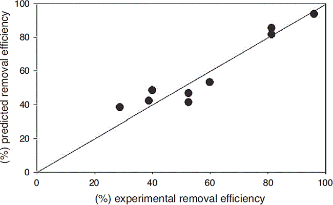 Regression equation provides predicted data from different experimental condition and it’s compared with experimental data shown in Figure 8. Table 7 shows the regression analysis. Experimental and predicted values of the removal efficiency of benzeneacetic acid are almost equal. So as to the model tells the interaction of process parameters. ANOVA was derived to observe the null hypothesis for the regression shown in Table 8. A p value less than 0.05 was chosen which show the estimated model is considerable. The predicted and the experimental response (benzeneacetic acid removal) show a very good agreement with each other, and the coefficient determination (R2) of 0.91 implicates a good fitted of the model (Fig. 8).