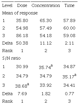 Adsorption batch runs were performed for optimization process according to an orthogonal array L9 (Table 3) and results obtained from each set as are (%E) given in Table 4. In each experimental run, 10 mL of aqueous benzeneacetic acid solution of known concentration and the known amount of nanoparticle of CaO2 were taken in 100 mL Erlenmeyer flask. The flasks were agitated at a constant shaking rate at 22 ± 2°C in a water bath controlled shaker (REMI, RSB-12, and India). At the end of shaking, the samples were centrifuged and the supernatant used for determination of the benzeneacetic acid concentration.