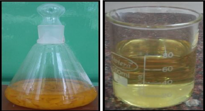 About 25 g of dried and finely sliced peels are taken and added into 100 ml of distilled water and heated for 30 min. The crude extract is then filtered out using Whatman No. 1 filter paper to get a clear bio extract (Fig. 1). Silver nanoparticles are synthesized from silver nitrate by using aqueous bio extract of carica papaya peels as reducing agent.