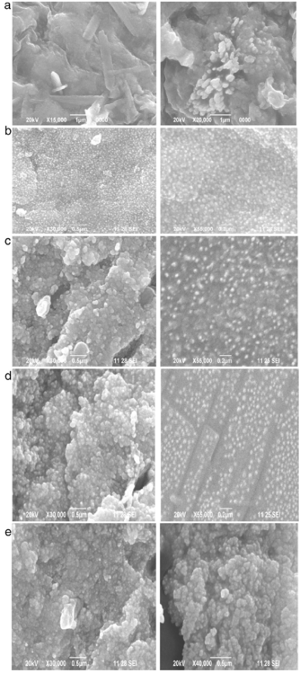 Scanning electron microscopy (SEM) analysis is performed for studying the surface morphology and shapes of silver nanoparticles. Figure 10 (a-e) shows the SEM images of various magnifications of silver nanoparticles synthesized using 5 ml, 10 ml, 15 ml, 20 ml and 25 ml concentrations of carica papaya peel broth respectively. It is observed that the silver nanoparticles are spherical in shape and the concentration of the extract alters the size and shape of nanoparticles. The particles are uniformly distributed and no aggregations are observed for 5-15 ml of peel extract. But the particles get agglomerated as the concentration of papaya extract increases above 15 ml as can be evidenced from Figure 10 (d-e). The agglomeration of particle leads to destabilization of silver nanoparticles (Narmadha, Hemashenbagam, Sathiya Vimal, & VasanthaRaj, 2013).