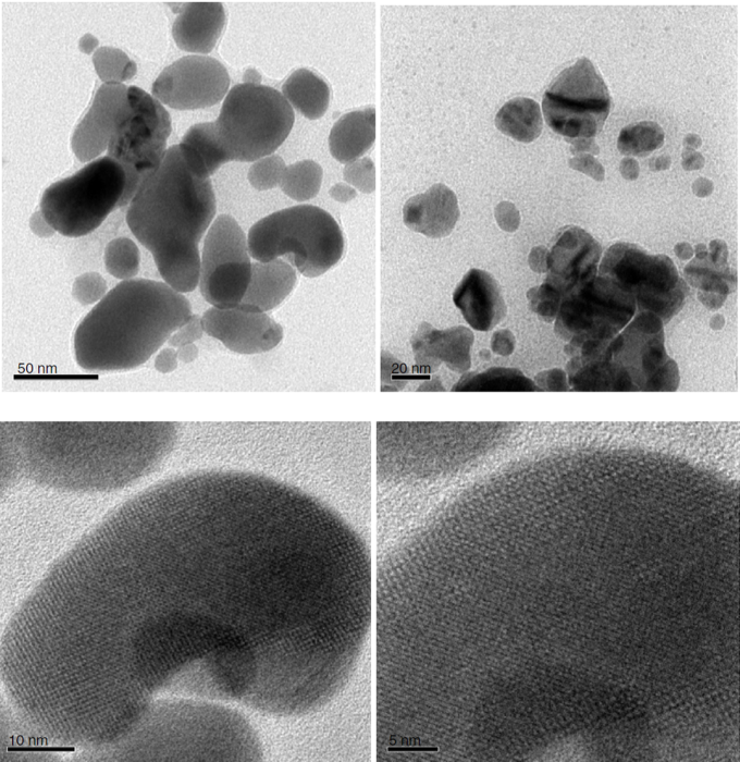 The TEM images of silver nanoparticles synthesized using aqueous extract of carica papaya peel are shown in Figure 11. The concentration of the extract alters the shape and size of silver nanoparticles in the solution. These images suggest that the morphology of the nanoparticles is mostly spherical in shape. A few agglomerated nanoparticles are also observed in some places, thereby indicating possible sedimentation at a later time. The average particle size of silver nanoparticles is found to be from 15 nm to 20 nm. The results are in good agreement with the crystallite size obtained from XRD analysis.